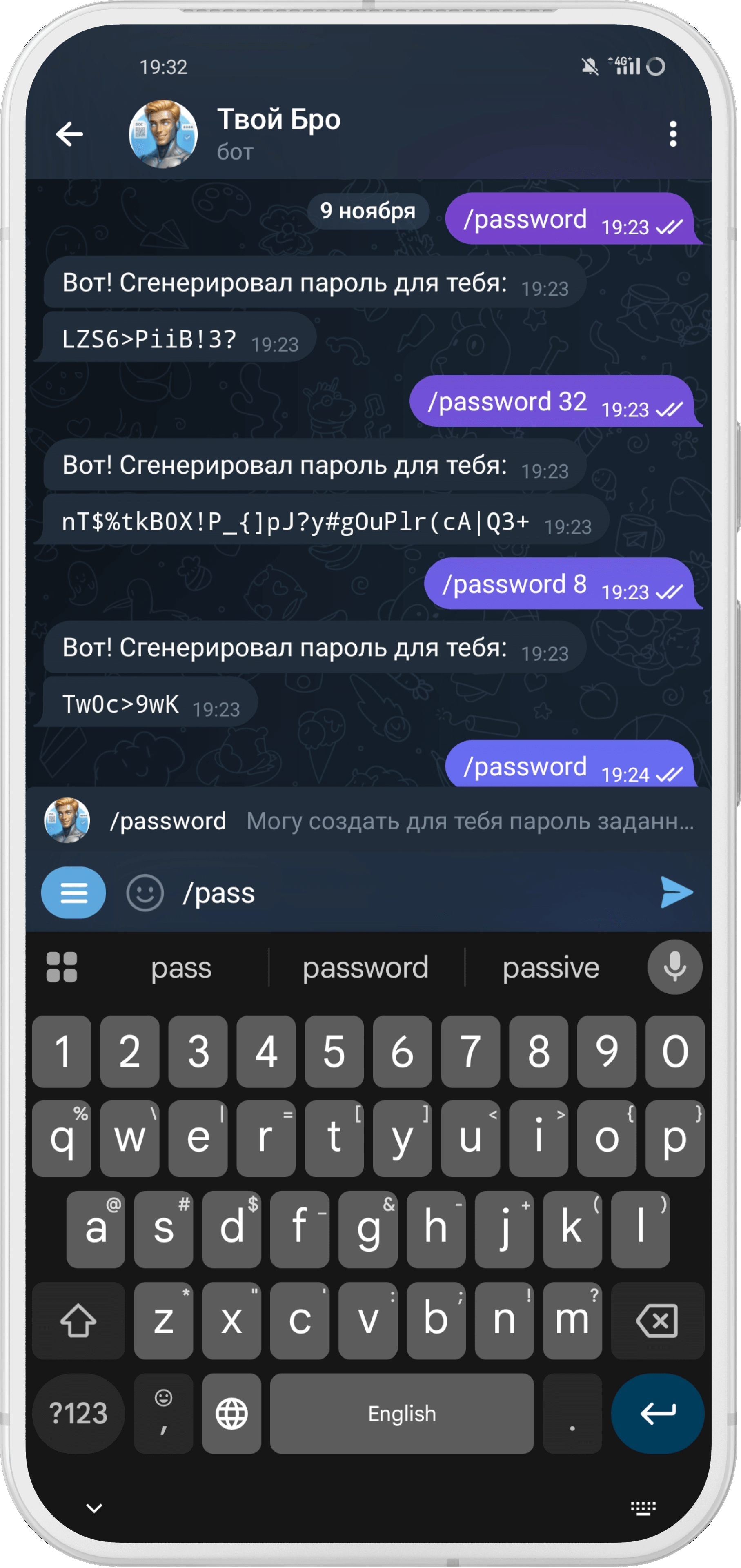 Если тебе вдруг понадобится надежный пароль, то можешь не ломать голову, а просто попросить меня.